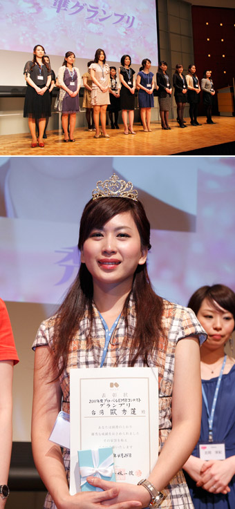 | 「グローバルEMBコンテスト」の翌日、4月24日(火)には東京ドームホテルで早くも表彰式が行われました。グローバル大会に出場した全16名の中から今回選出されるのは、グランプリ1名、準グランプリ2名、美的賞1名、そして今年から新設された特別賞1名の、計5名。果たして、世界一の栄冠は誰の手に!? 審査のポイントは、昨年と同じく「お客様役の人との会話を通してきちんと要望を得ているか」「基本のメークテクニックでお客様役の望むキレイを実現できたか」の2点。また「この人にまかせたい!」と思われるような、その人自身の?オーラ?も評価の対象になります。でも私から見ると、前日のグローバル大会では全員がそれをかなえているようにも思えたし、16人をいっぺんに審査したため昨年程はひとりひとりを細かく見れなかったし、しかも海外スタッフは言葉がわからないし…。というわけで、誰が選ばれるか、昨年よりも予想するのが難しかったです。 そして、昨日とはうって変わって華やかにドレスアップした16名が表彰の舞台に登壇。――さぁ、いよいよ発表です! まず最初に発表されたのは準グランプリ。ひとり目は韓国代表のソン スッジュさん(釜山 新世界百貨店 センタムシティ店勤務・38歳)。ソンさんはコスメデコルテのNo.1美容液「モイスチュア リポソーム」にほれ込んでコーセーに入社。接客&メークスキルももちろんですが、透明感に満ちた美肌がとても印象的! 「私は普段から、お客様にとって家族のような存在になれるよう努力しています。私のカウンセリングを通してお客様に商品をご購入いただき、そして肌悩みが改善して喜んでいただけるのを見ると、私も喜びを感じます。コンテストでは笑顔と思いやりを忘れず、お客様の魅力を最大限に引き出すメークを心掛けました。今回の受賞は私だけでなく、韓国の美容スタッフにも希望と喜びを与えてくれたと思います。コーセーは私のもうひとつの家族。本当に、感謝の気持ちでいっぱいです!(ソンさん)」 準グランプリふたり目は、小島千枝さん(首都圏西支店 カネマスヤ勤務・30歳)。接客時の笑顔がとても好印象で、「この人なら安心して身をゆだねられそう!」と思えました♪ 「私は元々化粧品が大好き。特にコーセーのファンで、いつも笑顔で接客してくれた美容スタッフの方に憧れて入社しました。私も笑顔は誰にも負けません! 最大の喜びはお客様から『あなたがいてくれて良かった』と言っていただけること。コンテストでは特にベースに力を入れ、優しさは残しつつ派手にならないメークを心掛けました。今回選ばれたのは、周りの方々に育てていただいたからこそ。この感動を皆さんと分かち合いつつ、準グランプリの名に恥じないよう、これからさらに気を引き締めて頑張っていきたいと思います!(小島さん)」 そしていよいよグランプリの発表です! 選ばれたのは…台湾代表オウ シューレンさん(屏東太平洋百貨店勤務・34歳)でした!! 審査のふたつのポイントも、オーラもすべてバランス良く兼ね備えているオウさんは、満場一致で選ばれたそう。名前を呼ばれた瞬間、感動のあまり涙を浮かべ、こちらまでもらい泣きしてしまいました。「普段から『EMB接客』を心掛けていますが、コンテストでもお客様役の方と自然に連動し、普段どおりの実力を発揮できました。ニーズにきちんと応えられたことが、高い評価につながったのだと思います。私がここまで成長できたのは、コーセーの教育のおかげ。上司や同僚、お客様など、多くの方々から信頼と支え、自信を与えていただいたからこそ、今の私があります。心から感謝しています! 今後もすべてのお客様に対して、一期一会の気持ちを常にもって接していきたいですし、仲間と一緒に日々学習しながら成長していきたいです(オウさん)」 お次は特別賞。コーセー小林一俊社長の立案で今年から新たに設けられた賞で、特にメークアップスキルに優れたスタッフが選ばれます。見事特別賞に輝いたのは、佐藤誠子さん(八王子支店 吉祥寺サンドラック プラムサンロード店勤務・43歳)。特にブルー系のアイメークの仕上がりがとても美しく、お客様役の爽やかなイメージにもピッタリ! 「イメージどおりにメークできたことが、今回の受賞につながったと思います。下まぶたに白パールのラインを入れることで黒目を強調させ、輝きを増すことができました。選ばれたときは、信じられない気持ちと感謝の気持ちでいっぱいでした! 女性はいくつになっても美しくありたいと願うもの。これからも、今までの経験を生かしながら、少しでも多くの女性の『キレイのお手伝い』をして、自分の、そしてコーセーのファンをたくさん作っていきたいです!(佐藤さん)」 そして最後に美的賞。これはほかの賞とは選考ポイントが異なり、「素の美しさを引き出して、その人に似合うメークをしているか」「美しくなることの楽しさを伝えているか」という『美的』ならではの視点から、本誌・兵